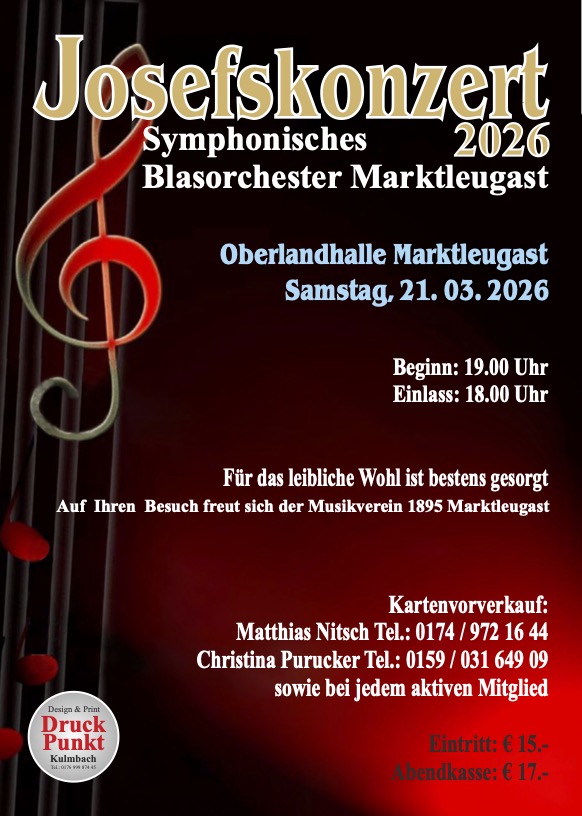 Der Musikverein Marktleugast lädt herzlich zum Josefskonzert 2026 ein.Am Samstag, 21. März 2026, findet das Konzert in der Oberlandhalle Marktleugast statt. Beginn ist um 19