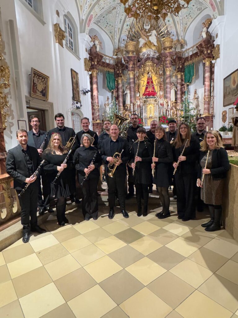 Mit dem Gesang von Irina Gick erhiel­ten bekannte Weih­nachts­lie­der wie „O little town of Beth­le­hem“ und „Herbei, o ihr Gläu­bi­gen“ eine innige und feier­li­che Note. Der Andachts­jod­ler verband Gesang und Bläser­klang zu einem musi­ka­li­schen Gebet, bevor bei „Tochter Zion“ das Publi­kum einge­la­den war mitzu­sin­gen. Mit „Angels We Have Heard on High“ erklang anschlie­ßend ein jubeln­des Weih­nachts­lied, gefolgt von einem Christ­mas Medley No. 3 des Flöten­en­sem­bles mit inter­na­tio­na­len Weih­nachts­me­lo­dien.